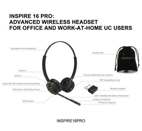 INSPIRE 16PRO DUO is a Bluetooth headset for office, work-at-home and UC users who want to have an ideal wireless headset at an affordable price. It frees you from desk, so you can walk and talk, building your most optimal working style. Dual connectivity makes it easy to switch between mobile devices and PC. You can deploy the headset very fast using plug-and-play Bluetooth adapter. Enjoy your wireless freedom with this ideal companion!